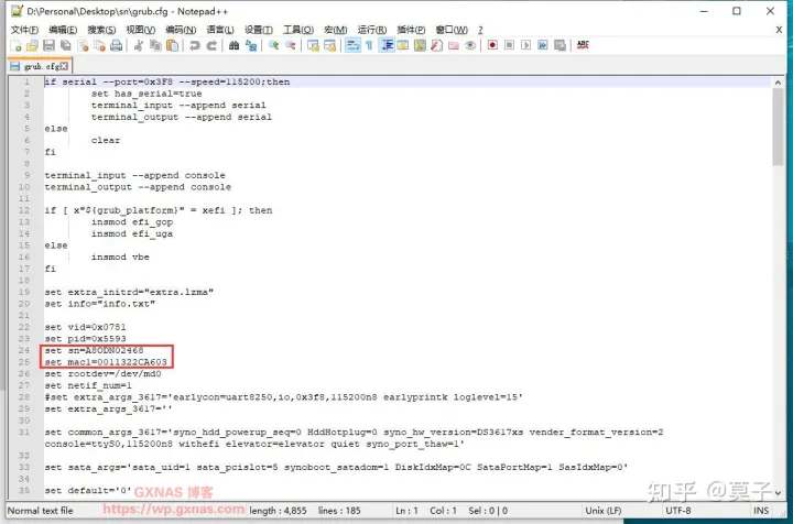 九、在你的电脑,用Notepad++打开刚才下载的grub.cfg这个文件(注意不要用记事本编辑,否则有可能格式会乱),修改第24-25行显示的sn mac1;