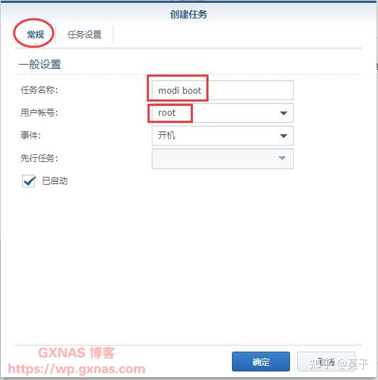 四、常规选项:任务名称随意命名,我写的是“modi boot”,需要注意的是用户账号要选root,先不要点确定!先不要点确定!先不要点确定!;