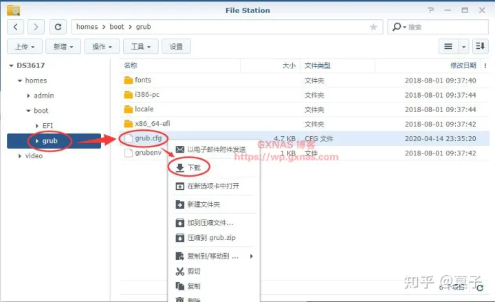 八、进入grub这个文件夹,找到grub.cfg,右键,下载;存放到你方便修改的地方;
