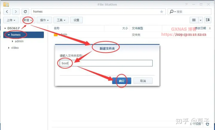 一、在电脑浏览器以管理员admin登录黑群晖,打开桌面Flie Station,在homes处(不一定非要在homes文件夹下新增,在任意文件夹均可)新增文件夹,取名boot;